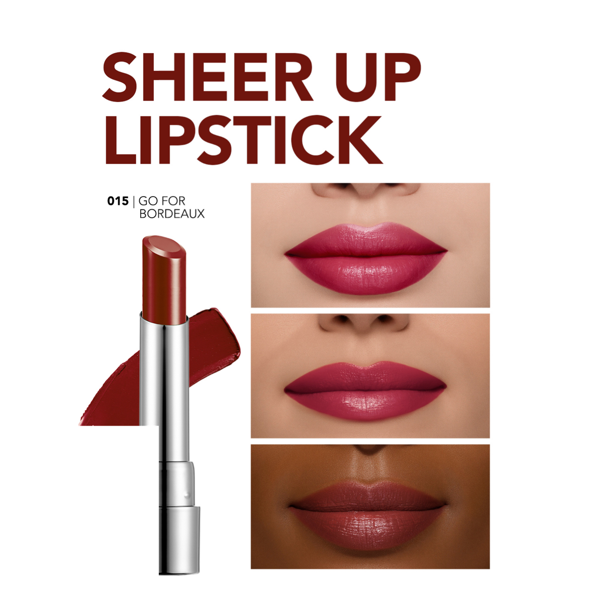 رژ لب Flormar Sheer Up Lipstick 015 – Go For Bordeaux یک رژ لب مرطوبکننده با بافت سبک و نیمهشفاف از برند فلورمار است که لبها را با رنگ بوردو براق، لطیف و طبیعی نشان میدهد.