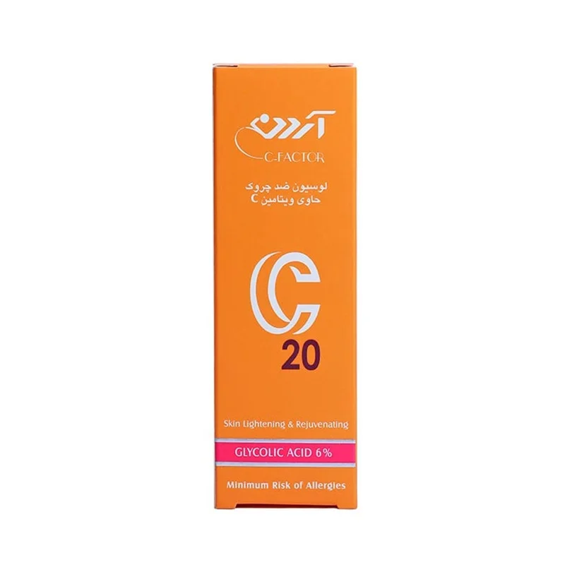لوسیون ضد چروک آردن مدل C20 ، حاوی آسکوربیل سیلان C (فرم فعال، پایدار و قابل جذب ویتامین C) و 6 % اسید گلیکولیکT کاهش دهنده عمق چین و چروک های پوست صورت و گردن، از بین برنده شلی و افتادگی پوست وسفت کننده، استحکام بخش و قوام دهنده پوست است که از فرآیند پیری زودرس جلوگیری به عمل آورده و علاوه بر دارا بودن اثرات قوی جوان کنندگی، به رفع تدریجی لک های قهوه ای و تیرگی های پوست کمک فراوانی می کند. مصرف همزمان این فرآورده با سایر محصولات روشن کننده باعث تاثیر بهتر و سریع تر جهت رفع لک ها و تیرگی های سطح پوست می گردد.